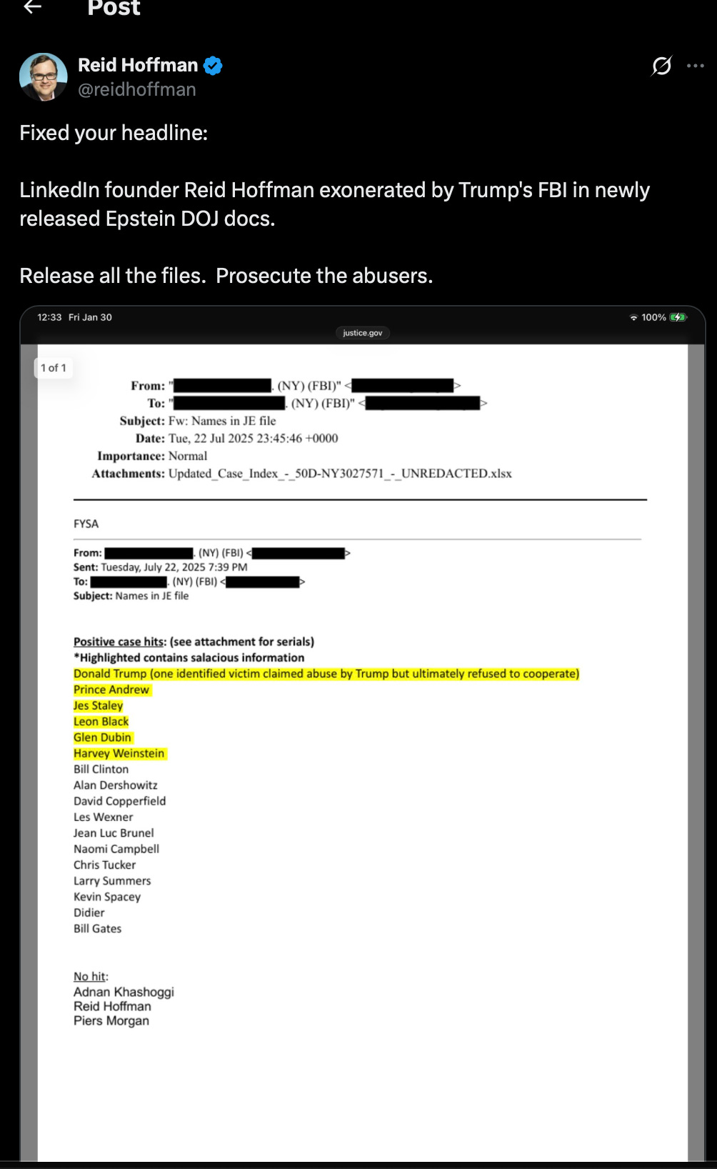 Reid Hoffman claimed he was exonerated by the FBI by posting an email from the released Epstein files in which the FBI allegedly said there were “no hits” on Hoffman.